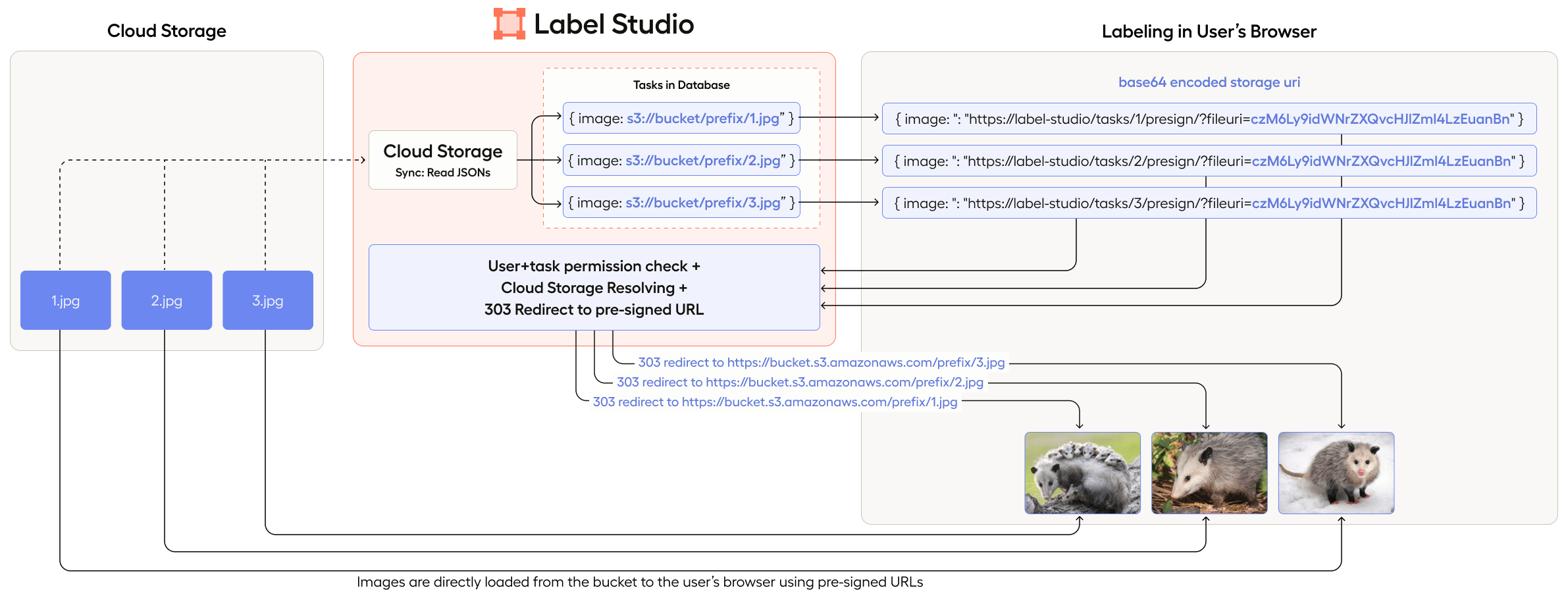 Task data synced from cloud storage is not stored in Label Studio. Instead, the data is accessed using a URL. You can also secure access to cloud storage using cloud storage credentials. For details, see Secure access to cloud storage.
