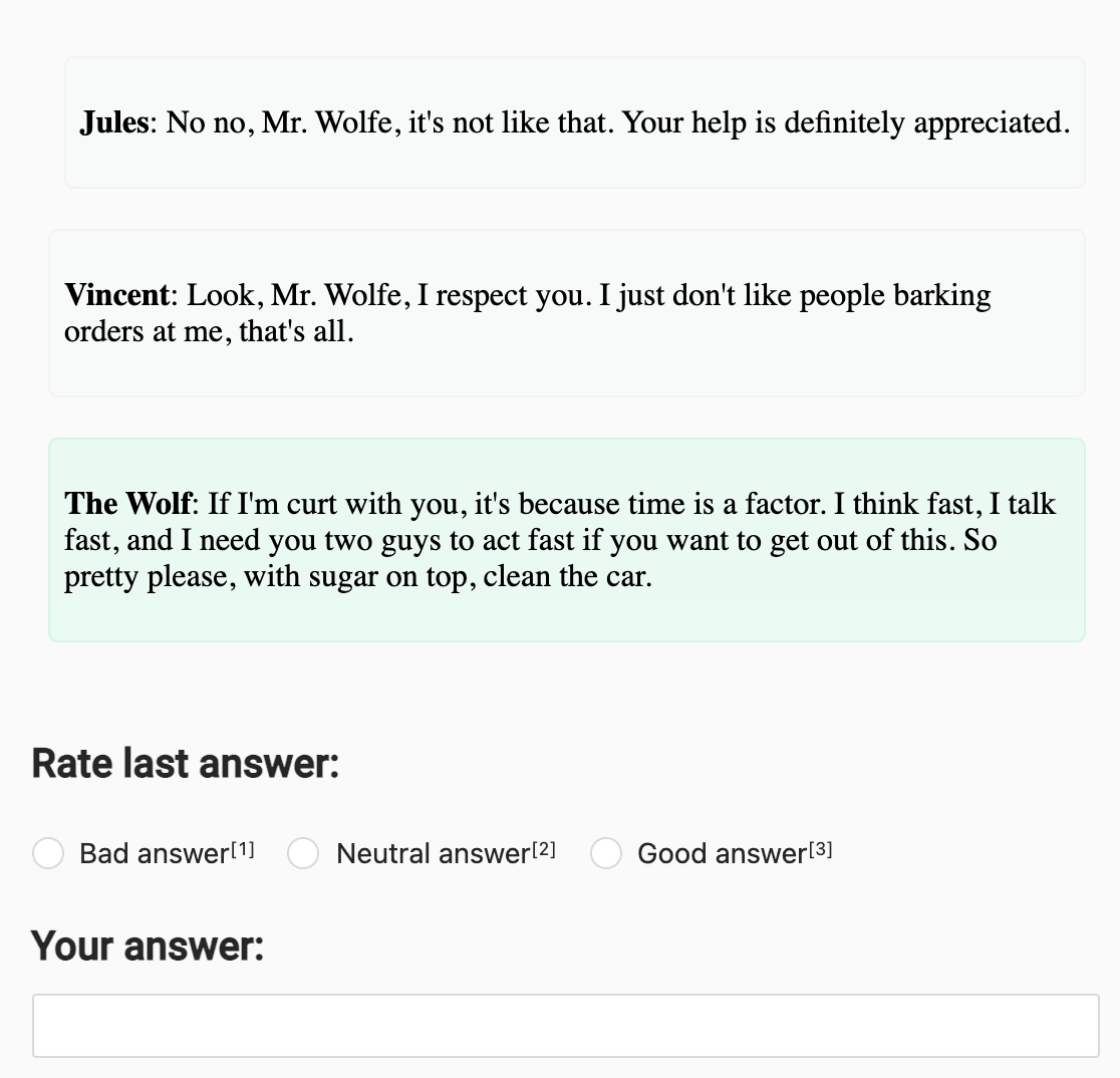 Use the TextArea control tag to provide annotators with a free text box to supply their own response to the dialogue. Add the editable=true argument to allow them