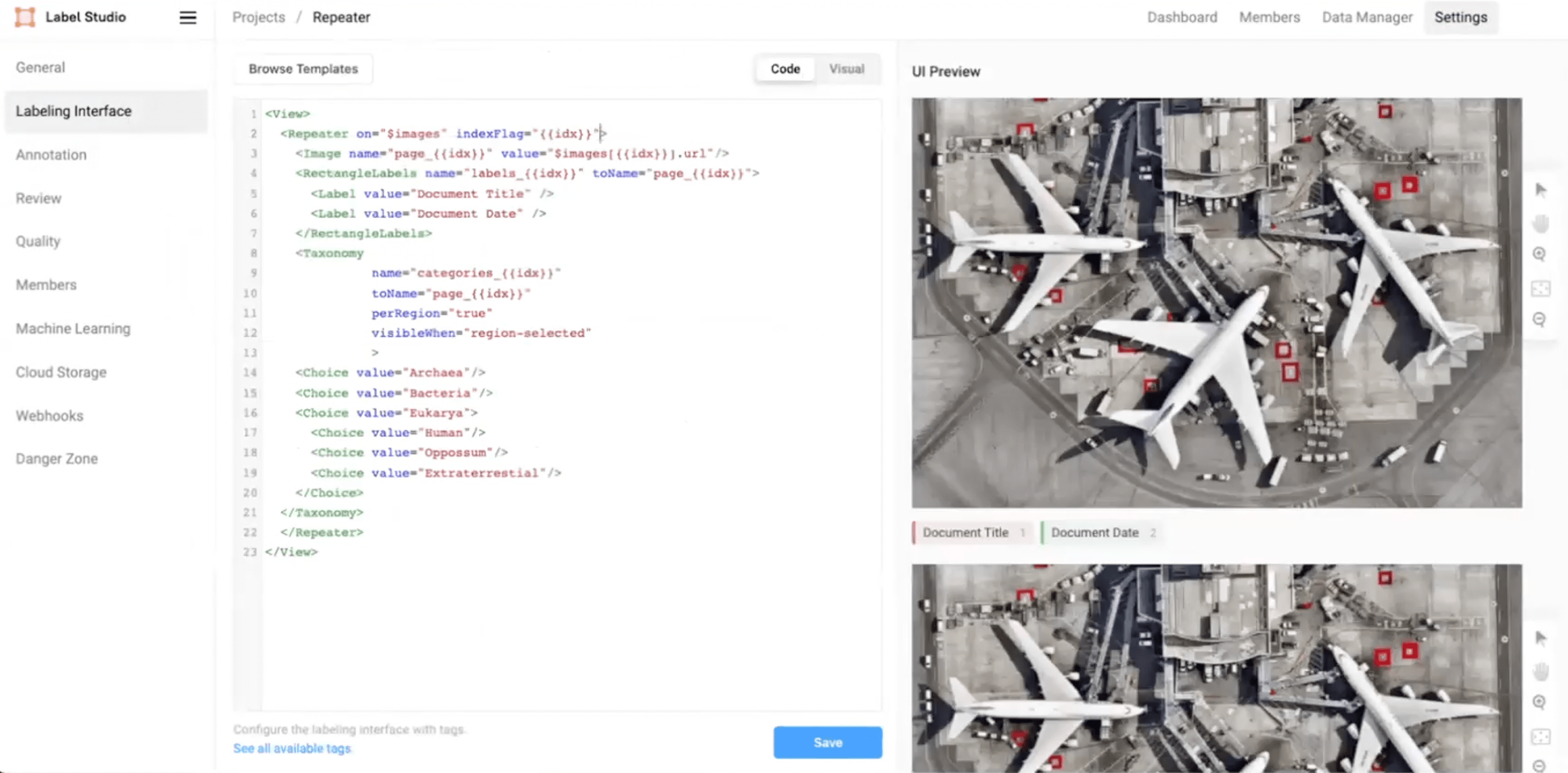 1. In the Label Studio UI, navigate to Settings >> Labeling Interface >> Code.