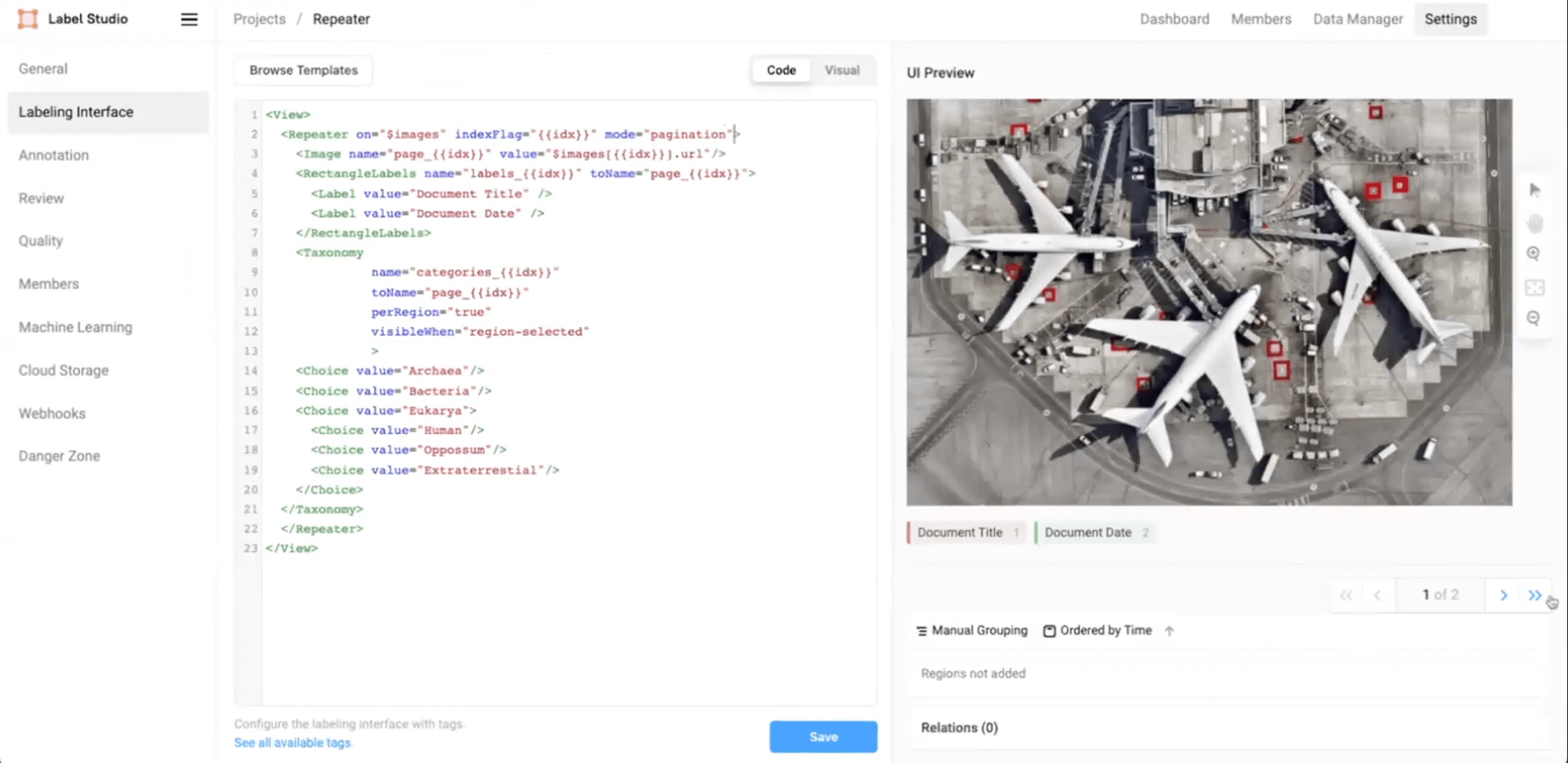 The simplest way to work with multi-page document annotation is to go in project settings and specify the following labeling configuration.