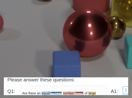 Create a dataset with answered questions about images using this visual question answering template. In response to an image, annotators can provide free-text answers to a question and also label components of a question with relevant aspects.